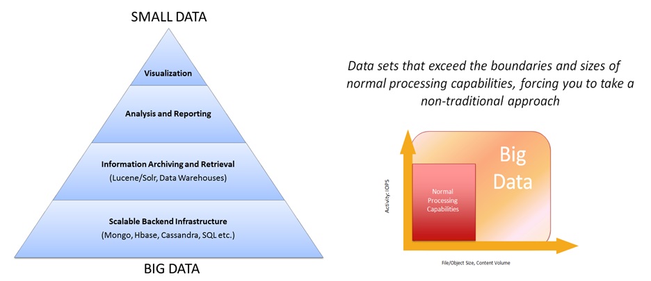Big data is commonly described as data that exceeds the processing capacity of conventional database systems. The data is too big, moves too fast, or doesn’t fit the structures of your database architectures. To gain value from this data, you must choose an alternative way to process it. While the term may seem to reference the volume of data, that isn’t always the case. The term big data – especially when used by vendors – may refer to the technology (which includes tools and processes) that an organisation requires to handle the large amounts of data and storage facilities.