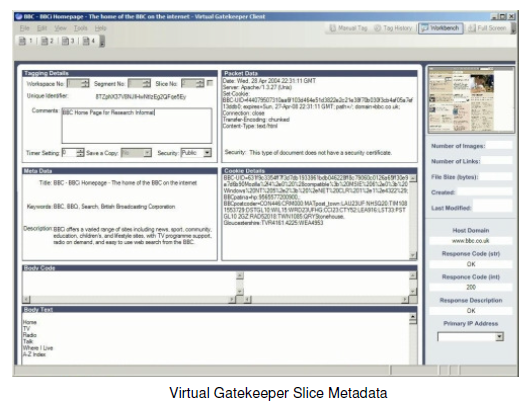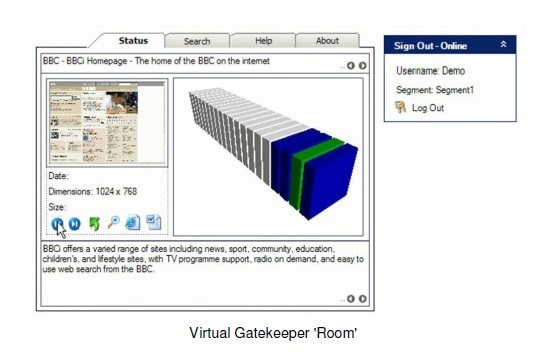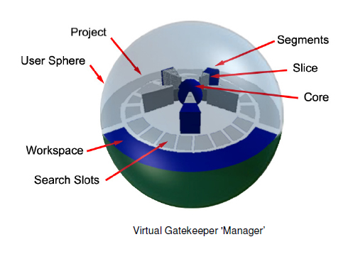 Virtual Gatekeeper was constructed as a means of demonstrating the implementation of the GMM model. All categories are visible with the addition of a central core which records use of the system linking into the database. In addition, search slots are shown; these record the results of searches made by the knowledge worker and recorded by the system. It should be noted that the conceptual model is based around the Workspace which consists of a number of search slots that are tied to it. Each labelled search slot would represent a single search that is useful for the category in which the knowledge worker resides. In this way a search (semantic or hyper-semantic) covers all lower categories that are based either on the local system of the knowledge worker and unique to their session, or search across all lower categories associated with the category which they are in.